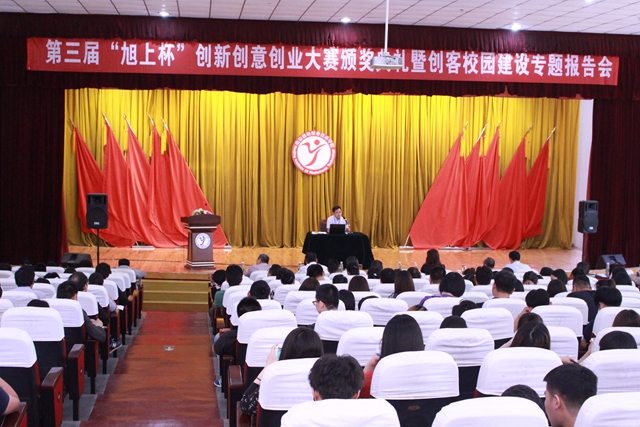 5月16日下午,学院第三届“旭上杯”创新创意创业大赛颁奖典礼暨创客校园建设专题报告会在学院报告厅隆重举行。学院党委书记、院长周庆礼,党委副书记、常务副院长顾益明,纪委书记、副院长陈赵,副院长、继续教育学院院长郭朝辉,副院长刁爱军,副院长赵学洪,工会主席、办公室主任孔德丽及学院全体教职工和部分学生代表出席了本次会议,会议由科研及校企合作处处长李木香主持。