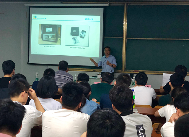 巡讲开始,南京创客空间创始人郑岩峰先生带来了“创客时代的创新机遇”的主题分享,他从如何获得创新机遇、创新的难点、创新创业的基本技能和在比赛中历练创新技能等几个方面利用大量的创新创业案例跟大家进行了分享。随后,他从作品的创新创意优势,作品的完整性和作品的应用前景分析了历年中美青年创客大赛获奖作品代表的特点,并对2018年中美青年创客大赛的参赛热点进行了剖析。