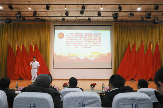 在学院关心下一代工作委员会的关心与支持下,本次大赛由我院团委发起,历时一个月,通过各系部层层选拔,最终产生十名选手晋级决赛。决赛分为主题演讲和材料评述两个部分,通过对“大国工匠精神”、“改革开放四十年”、“校庆欢歌,机电腾飞”、“小小创客,共筑未来”、“我爱你,中国”五个主题的阐述,加深了同学们对“风雨砥砺,笃志前行”这一主题理解。比赛开始前,选手们依次上台作自我介绍,为接下来的赛事作赛前宣言。