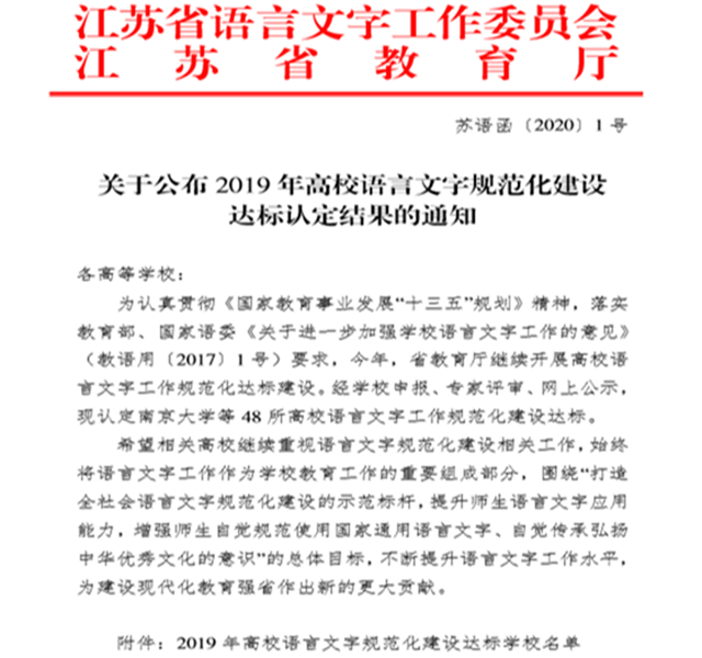 2019年1月8日,江苏省教育厅 江苏省语言文字工作委员会发布《关于公布2019年高校语言文字规范化建设达标认定结果的通知》(苏语函〔2020〕1号),经学校申报、专家评审、网上公示,认定48所高校语言文字工作规范化建设达标。