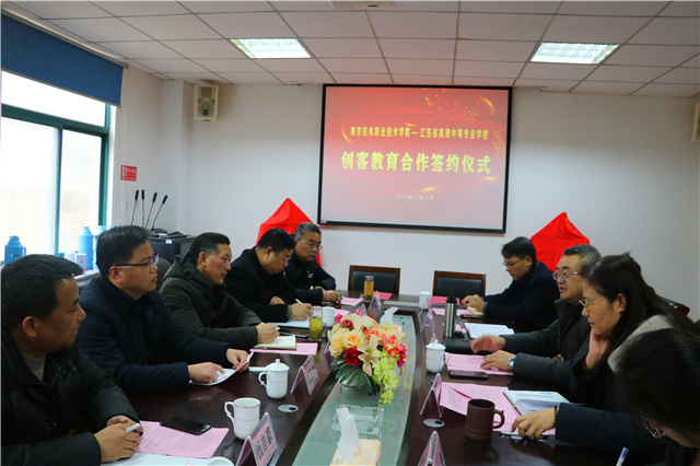 1月11日上午,开云手机官方版页面登录入口与江苏省高淳中等专业学校创客教育合作签约仪式在我院弘德楼213会议室举行。江苏省高淳中等专业学校校长芮龙兵、副校长丁金水、副校长钱自豪、副校长王旺才、办公室主任赵芬、学生处主任夏一鸣莅临我院参加签约仪式;我院纪委书记、副院长陈赵,副院长刁爱军、智能制造学院院长潘理平、院办主任彭璐、学工处处长张宝中、蓝岛创客空间主任王国珍参加了本次活动。