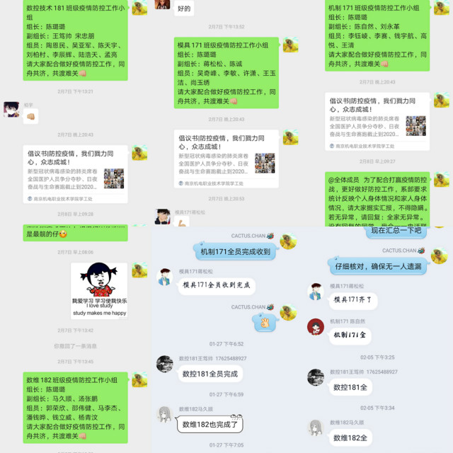 俗话说:“火车跑得快,全靠车头带”,班干部是班级同学的带头人,是班级的骨干力量,对班级同学的情况更为了解、更为熟悉,尤其每个辅导员都带好几个班,正是有了班干部的得力辅助,很多事情事半功倍。疫情当前,各班成立了以辅导员为组长,以班长、团支书为副组长,以其他班委为组员的疫情防控小组,时刻关注班级同学动态,做好班级同学的身体情况、家庭住址、家人身体情况的更新汇总,第一时间掌握疫情现状。