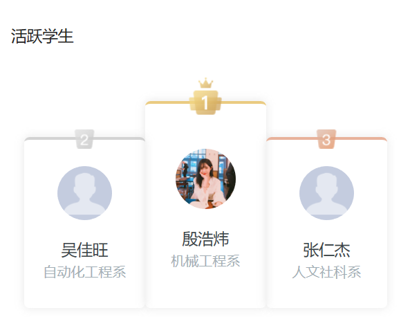 超星泛雅平台统计,教师和学生在线教学互动方式丰富,参与课堂讨论,提问等教学互动人数较高,平台教师与学生活跃度普遍较高。最近一周最活跃学生前三分别是:机械工程系殷浩炜,自动化工程系吴佳旺,人文社科系张仁杰。机械工程系的学生的活跃度是全院最高的。最近一周活跃专业前5名:机电一体化技术、电气自动化技术、机械制造与自动化、机械设计与制造、数控技术。最近一周教师资源上传前5名:黄晓萍、卢彬、李萍、杜婷婷、王卓。