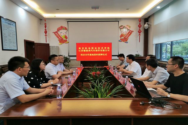 随后,学院一行5人在泰兴市高新技术开发区管委会副主任邱明波的带领下分别前往苏德福来汽车部件有限公司、江苏佳佩环保机械设备有限公司进行校企合作专题对接活动。学院领导与企业领导就人才培养、项目合作等校企合作事宜进行了深入的交流,初步达成合作意向。学院分别与两家公司签订《就业创业实习实践基地建设协议》,并向两家公司授予“开云手机官方版页面登录入口大学生就业创业实习实训基地”铜牌。
