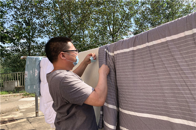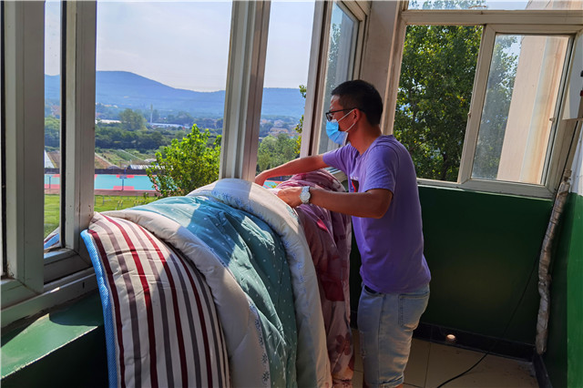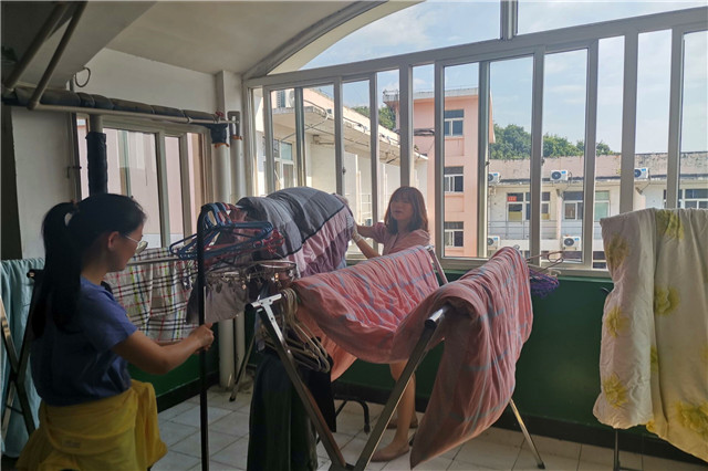 系部的老师和宿管阿姨们,逐一来到学生宿舍,帮助同学晒被子。在这个过程中,细心的老师们会给每一床被褥,贴上标签。早上九点,老师们准时来到宿舍,根据名单进行晒被。宿舍楼的阳台上、空地上的晾衣杆等都挂满了花花绿绿的被褥。中午两点半左右,老师们再将被子按照标签,一一放回原位。经过4个多小时日光浴的被子变得蓬松柔软。