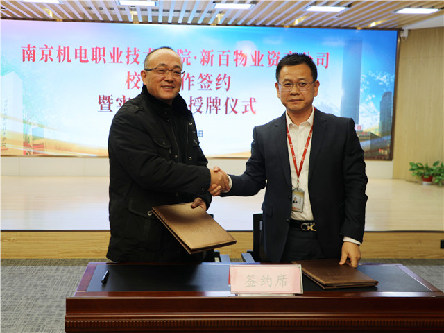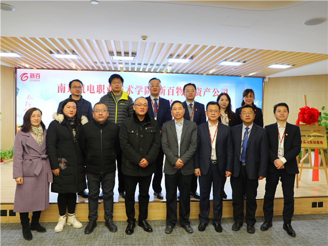 2020年12月16日上午,党委委员、副院长赵学洪带领科研与校企合作处、学生工作处、电子工程系等部门同志到南京新百物业资产管理有限公司参加校企合作签约暨实习基地授牌仪式,南京新百集团副总裁、公司董事长周雷、南京新百集团人力资源中心总经理何世岳、新百物业资产公司总经理熊新华、新百物业资产公司常务副总蔡丛辉、新百物业资产公司副总经理雷松楼、新百物业资产公司党支部书记王磊等领导接待了我院一行。仪式由新百物业资产公司行政人事部经理王莉主持。