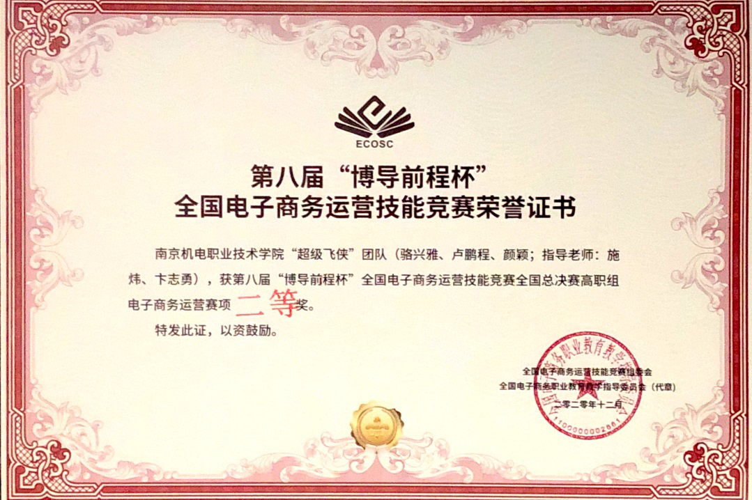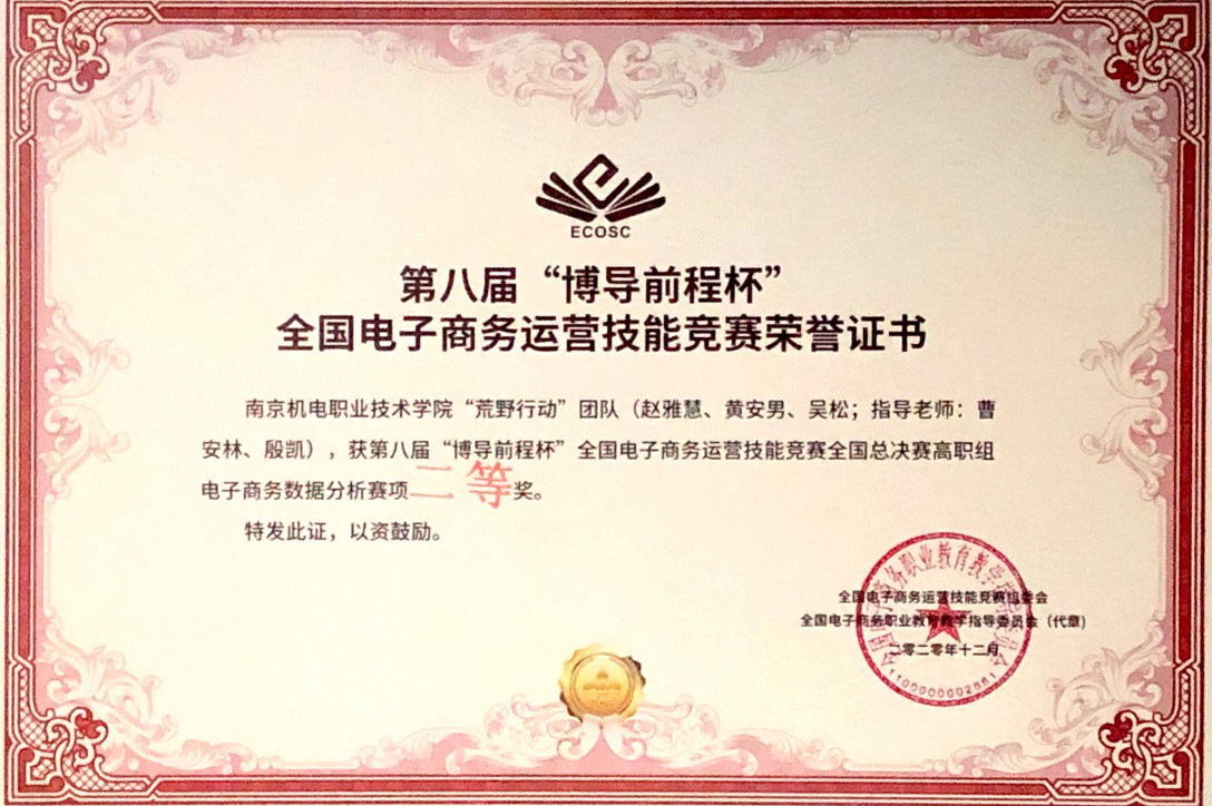 2020年12月29日,第八届“博导前程杯”全国电子商务运营竞赛决赛在苏州经贸职业技术学院举行。开云手机官方版页面登录入口电子商务运营“超级飞侠队”团队(骆兴雅、卢鹏程、颜颖;指导老师:施炜、陈洁)以及电子商务数据分析“荒野行动队”团队(赵雅慧、吴松、黄安男;指导老师:殷凯、曹安林)双双荣获高职组全国总决赛二等奖。