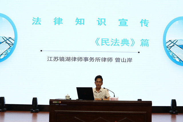 为进一步贯彻落实习近平总书记的重要讲话精神,发挥民法典在中国特色社会主义法律体系中的重要地位,在我校形成人人学习民法典、人人宣传民法典、人人遵守民法典的浓厚氛围。6月10日下午,学校举行《中华人民共和国民法典》宣讲报告会,特邀江苏镜湖律师事务所曾山岸律师为全校师生做了宣讲报告。