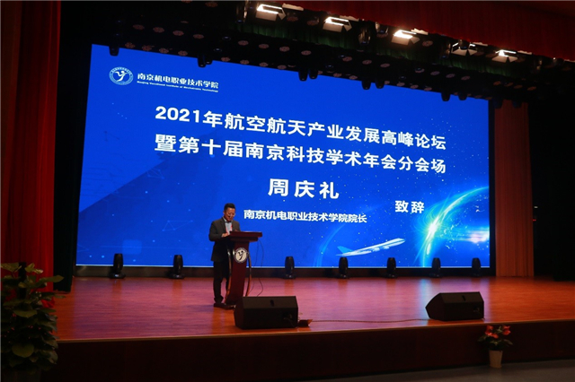 曾建江致辞,他介绍了省航空航天学会的建会情况。本着持续推动学术交流,推进航空航天学科的发展与知识融合的宗旨,省航空航天学会与南京机电学院共同举办2021年航空航天产业发展高峰论坛,促进高水平工匠人才培养,深化学术交流,增强学术影响力,推动区域航空航天企业发展。