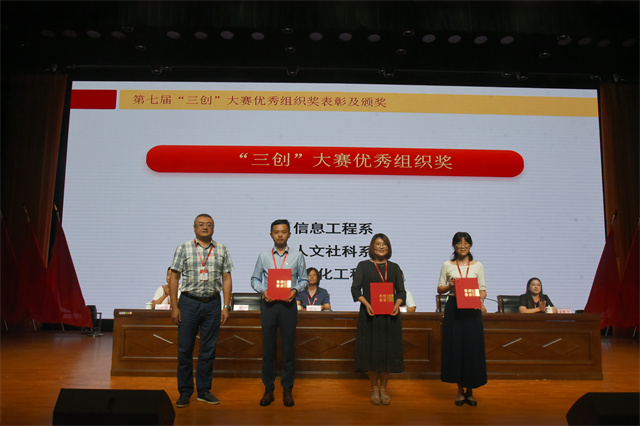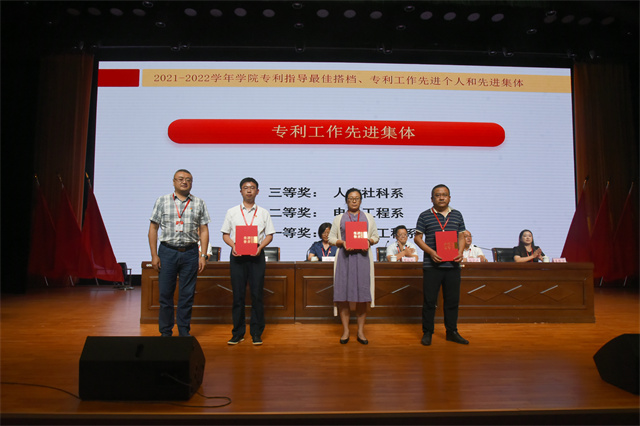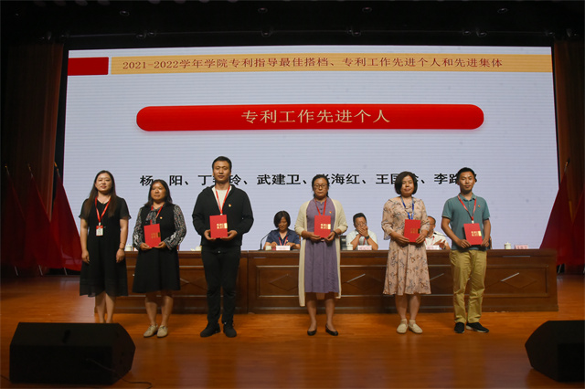 2021-2022学年专利指导最佳搭档、专利工作先进个人、先进集体等受表彰的个人和集体依次上台领奖。大会现场颁发荣获第七届“冠盛杯”创新创意创业大赛暨第八届中国国际“互联网+”大学生创新创业大赛的先进集体。