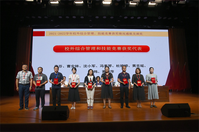 会上对2021-2022学年校外综合管理和技能竞赛获奖情况进行了通报并为获奖者颁发奖状。