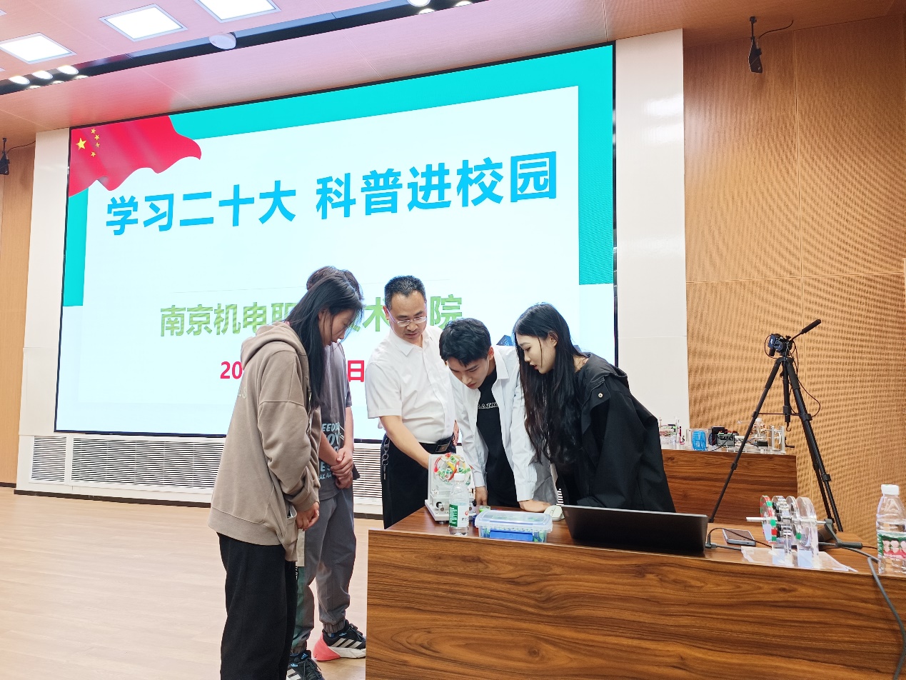 在乐学楼报告厅,由江苏省工程师学会STEM教育专委会副主员,江苏省科普教育基地主任、江苏省产业教授嵇明军带来电机原理绝技绝活科普讲座。嵇教授介绍了实验设备的电路知识和相关发明产品,演示了电感过渡过程装置和马蹄型磁铁,讲解了成套三相交流异步鼠笼式电动机模型和步进电动机模型,为同学们带来一场生动有趣的科普讲堂。