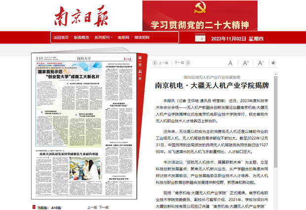 11月2日,南京日报A10版我的大学版块对我校无人机产业学院揭牌仪式进行了报道,全文报道如下: