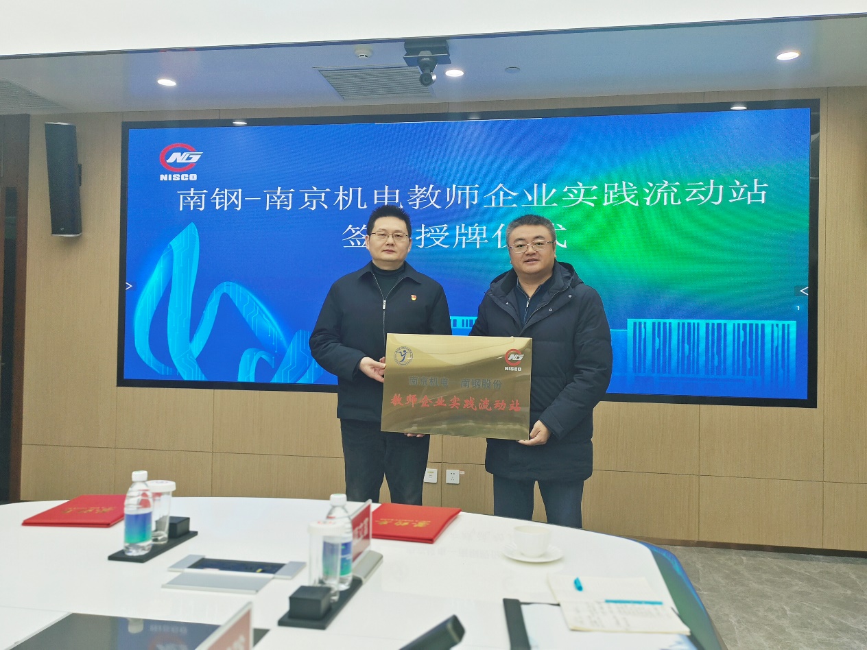 2024年3月6日上午,南京机电-南钢教师企业实践流动站签约授牌仪式在南京钢铁股份有限公司举行。南京钢铁股份有限公司人力资源部副部长孙斌,培训开发室主任仲崇波,规划配置室副主任王涛,学校党委委员、副校长刁爱军,科研及校企合作处处长李木香,机械工程系主任毛奇,高级督导潘理平等领导出席本次活动。南京机电-南钢教师企业实践流动站企业导师及进站教师参加了本次活动。本次签约授牌仪式为南京机电-南钢教师企业实践流动站建设与运行拉开了帷幕。