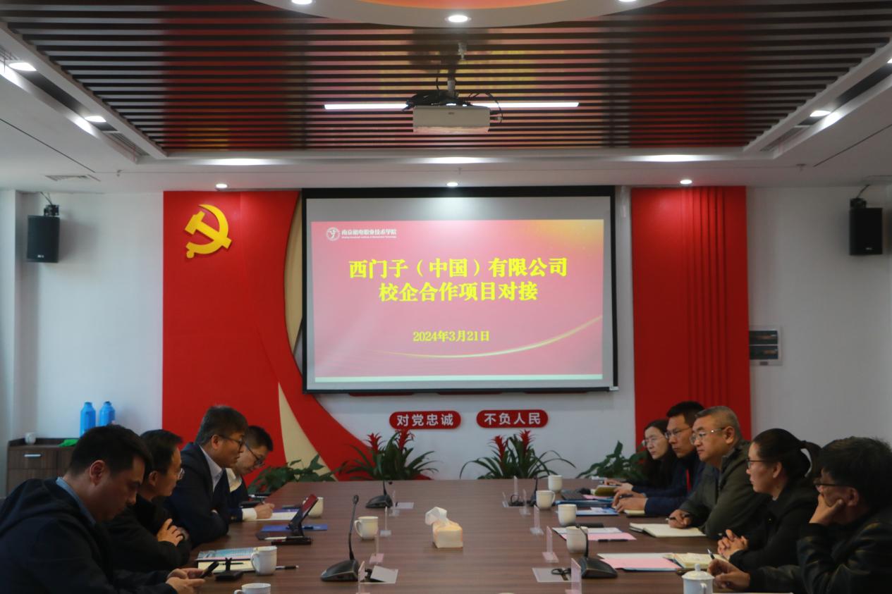 为进一步加强校企合作,提升学生实践、就业能力,促进毕业生高质量就业,构建产教融合新业态,2024年3月21日,学校与西门子(中国)有限公司开展校企合作洽谈会。西门子(中国)有限公司副总裁兼华东区域总经理张劲松,西门子江苏分公司总经理宋明,西门子南京办事处李明、徐伟,学校党委委员、副校长刁爱军,学工处处长张宝中,自动化工程系主任张海红,高级督导潘理平,科研及校企合作处处长李木香参加本次会议。