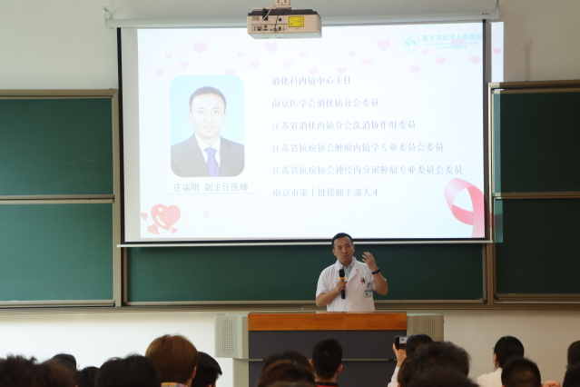 庄端明给大家讲授了幽门螺旋杆菌预防和消化道疾病的预防知识。随后,糖尿病学组杨小燕护士长和护理感染管理组刘三玉护士长分别向大家普及《青少年健康科普——糖尿病》和《校园防艾》的相关知识,他们用生动的案例和通俗易懂的语言,向同学们解释这些疾病的预防和应对措施。