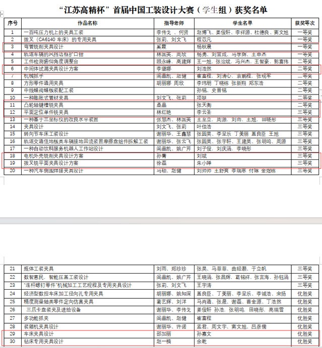 近日,由中国机电装备维修与改造技术协会主办,中机维工艺装备分会承办的“江苏高精杯”首届中国工装设计大赛历时三个月圆满结束。本次大赛行业企业和职业院校同台竞技,我校机械工程系师生组队共参赛10个项目,表现突出,成绩斐然,获奖率达100%。
