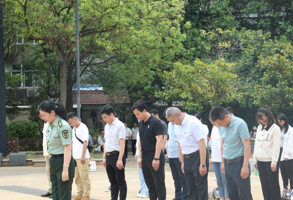 全体党员步行至“苏南抗战胜利纪念碑”前,郝麒、张进宝同志向革命先烈们敬献花篮,刁爱军同志整理挽联。同志们怀着无比崇敬的心情,默哀致敬,深切缅怀烈士不朽功绩,追忆伟大抗战精神。