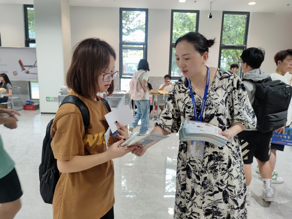 图书馆主动服务,为新生送上介绍图书馆的宣传彩页,旨在帮助新生快速了解馆藏资源与服务特色,引导他们探索知识的海洋,开启充实而有意义的大学生活。