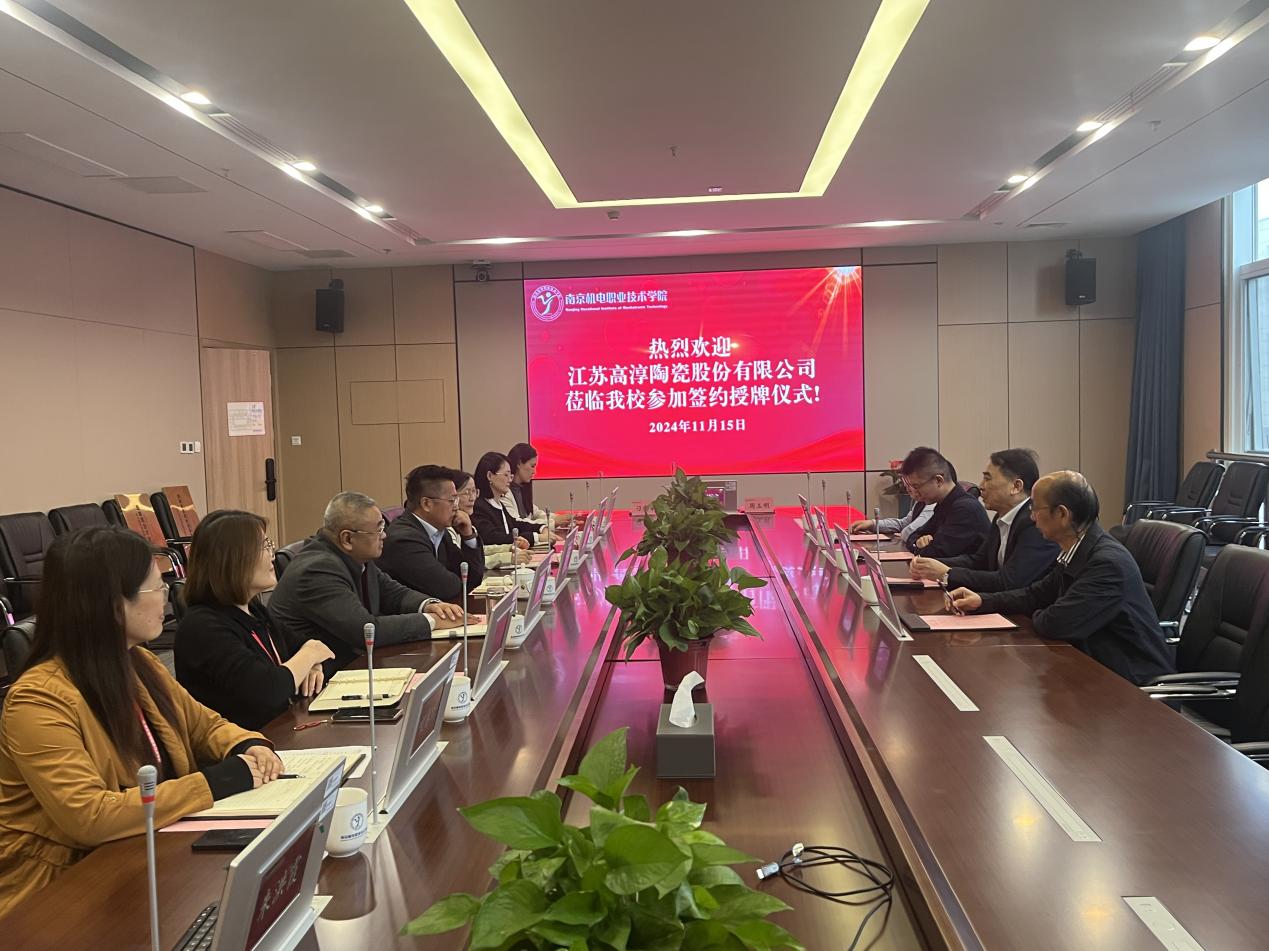 2024年11月15日上午,开云手机官方版页面登录入口与江苏高淳陶瓷股份有限公司举行了校企合作签约授牌仪式。江苏高淳陶瓷股份有限公司党委副书记周玉明,设计总监兰亭,产品发展中心经理庄志诚,人力资源部专员许燕,学校党委书记、校长周庆礼,党委委员、副校长刁爱军,科研及校企合作处处长李木香,人文社科系主任曹安林,人文社科系书记叶绘,人文社科系副主任啜春红,视觉传达设计专业负责人张萌出席本次活动。本次签约授牌仪式标志着双方正式建立校企合作战略关系,共同打造命运共同体,形成常态化的校企合作运行机制。