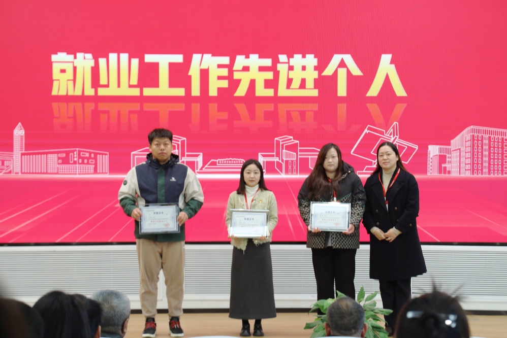 党委委员、纪委书记、工会主席姜振宇为获得“就业工作先进个人”的三位老师颁奖。