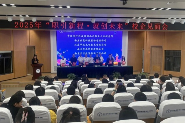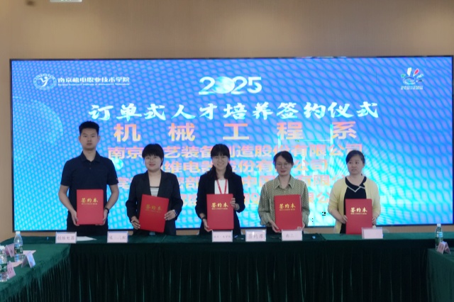 南京高职园管委会综合发展服务中心主任吴凯将南京高职园的情况向大家做了详细介绍,表达了对校企合作的支持与期待。在众人的见证下,学校党委委员、副校长刁爱军与中国电子科技集团公司第五十五研究所等5 家企业代表签署了校企合作协议,为双方在人才培养、科技成果转化等方面的深度合作奠定了坚实基础。