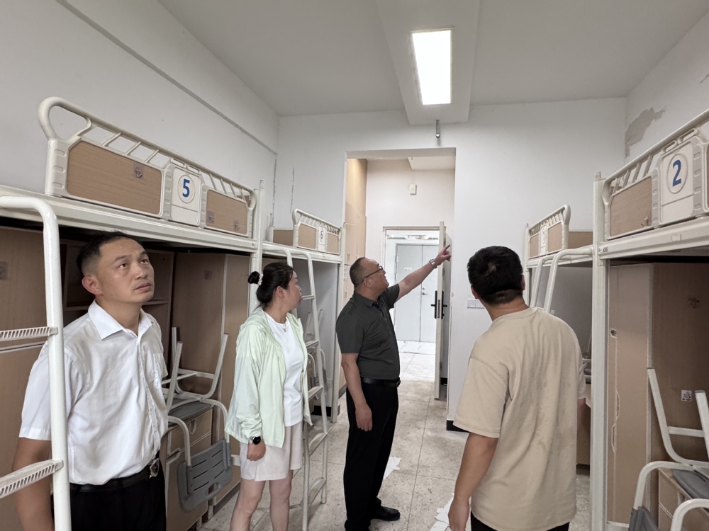 检查组一行实地走访了校园食堂、学生宿舍、绿化现场等重点区域,详细听取了维修工作进展汇报,并对施工质量、安全管理及工期进度进行了全面督导。在学生宿舍维修现场,重点检查了墙面翻新、门框加固等工程细节,要求施工单位严格遵循施工规范,确保工程质量和进度“双达标”。
