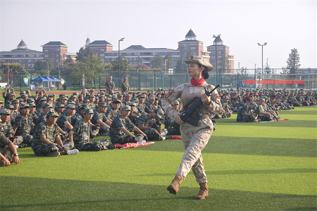 随后左星桥为同学们进行了精彩的阅兵队列口令与步伐展演。她标准利落的动作、铿锵有力的口令,生动再现了阅兵场上的严整风纪,同时也对国旗班队员队列和步伐进行指导,为其提供了直观的学习范本,激励他们精益求精,护卫国旗尊严。