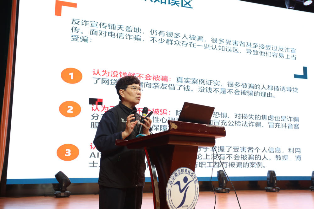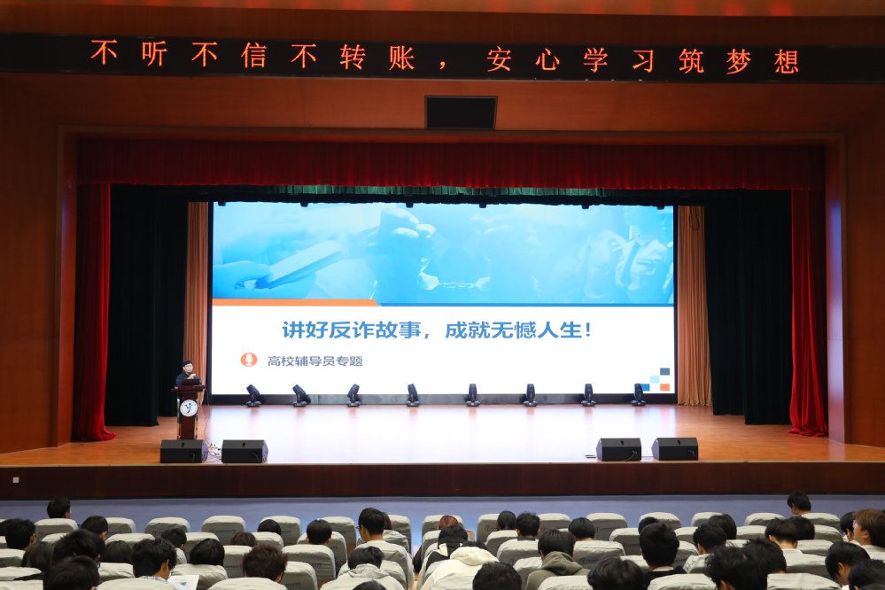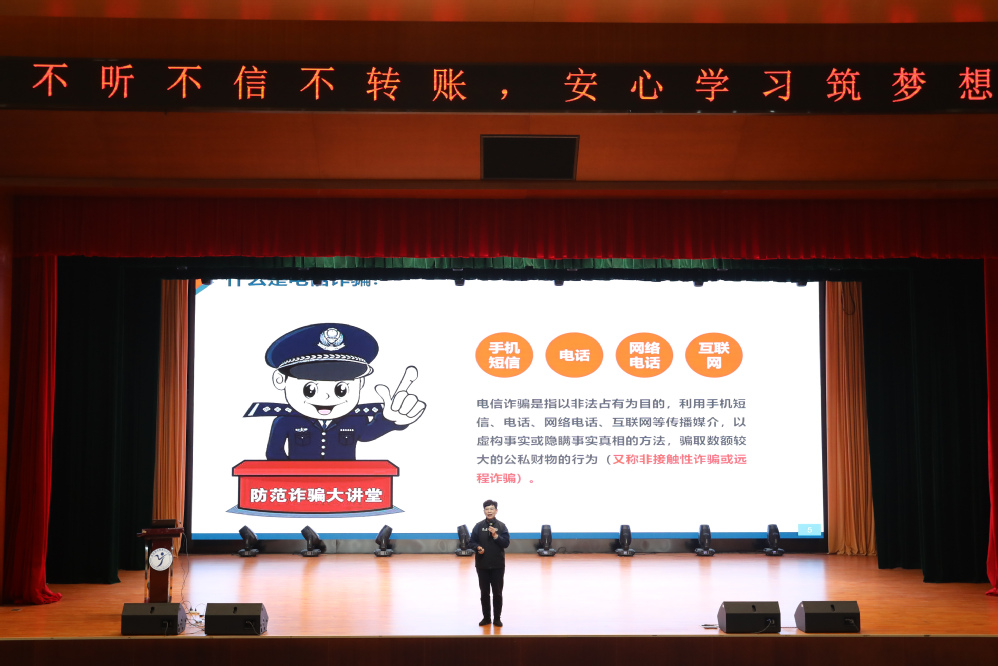 为深入贯彻落实习近平总书记关于打击治理电信网络诈骗犯罪工作的重要指示精神,切实筑牢校园安全防线,提升全体师生的识诈防骗能力,11月4日下午,我校特邀陈红燕警官走进校园,开展主题鲜明的反诈专题讲座。学校领导及学生代表800余人现场参与,共同筑牢校园反诈“防护网”。