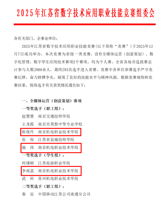 12月7日,2025 年江苏省“江苏工匠”岗位练兵职业技能竞赛全媒体运营(创意策划)赛项成功举办。学校信息工程系陈珑丹、施炜两位教师凭借扎实的专业功底和出色的实战能力,荣获职工组一等奖;学生李雨菡脱颖而出,斩获学生组一等奖,师生同台领奖,用亮眼成绩彰显了学校在数字技术应用人才培养领域的雄厚实力。