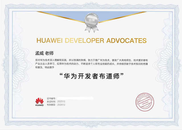 热烈祝贺学校信息工程系教师孟威凭借在华为技术领域的深入实践与推广贡献,成功被授予 “华为开发者布道师”(银牌)称号。