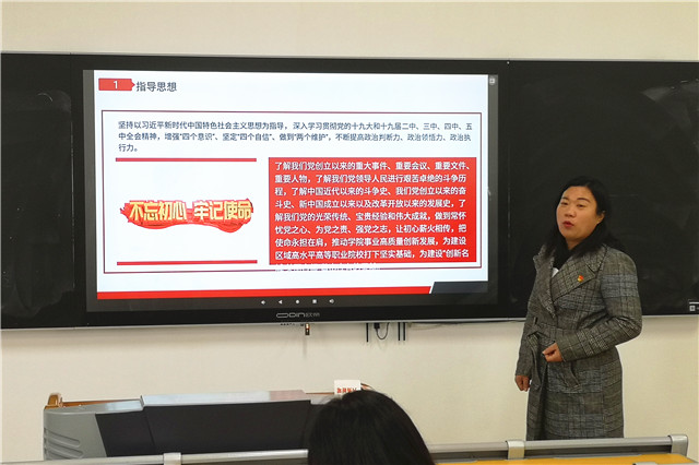 人文社科系党支部的第一次党史学习教育由思政中心的赵珊珊老师主讲。赵老师牢牢把握中国共产党历史的主题主线,重点梳理了中国共产党在新民主主义革命时期的历史事件,支部全体教职工深深感受到红色政权来之不易,深刻认识到强有力的领导核心对于党和国家事业的极端重要性。