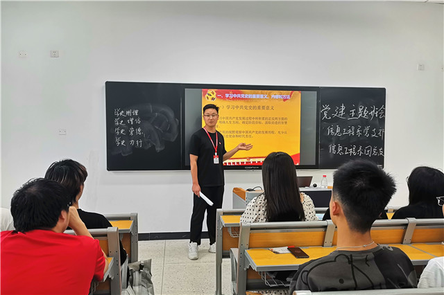 其次,信息工程系团总支书记于宇围绕《重温中国共产党党史》进行主题发言,从学习中共党史的重要意义、内容和方法,带领学生重温党的光辉历史,号召广大青年深入学习党史,并借助伟人邓小平通知的传奇经历,全面贯彻习近平总书记对青年学生的要求,重实践、勇担当、讲奉献,在日常生活中展现青年活力、青年担当,努力成长为能够担当民族复兴大任的时代新人。