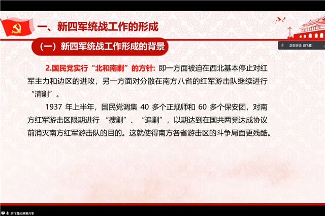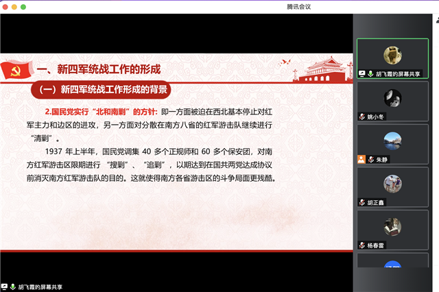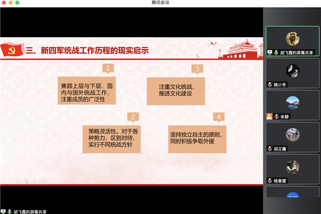 胡老师从新四军统战工作的形成、新四军统战工作的发展与壮大、新四军统战历程的现实启示三个部分生动、详细地介绍了新四军的统战工作。