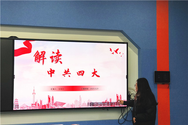 在本次学习中,吴婧佳介绍了大会的召开背景、主要议程以及召开意义。中国共产党第四次全国代表大会于1925年1月11日在上海召开,总结了国共合作一年来的经验教训,在党的历史上第一次明确提出无产阶级在民主革命中的领导权和工农联盟问题,是在中国革命形势由复苏走向高潮过程中召开的一次重要会议,标志着中国共产党对民主革命认识的进一步深化。中共四大开辟了“民主革命”时期的新纪元、开启了“群众性政党”实践的新里程、开创了“农民同盟军”革命的新道路、开始了“基层组织建设”规范化的新起点。因此,中共四大在党史上的功绩又被誉为“顶天立地,力量之源”。