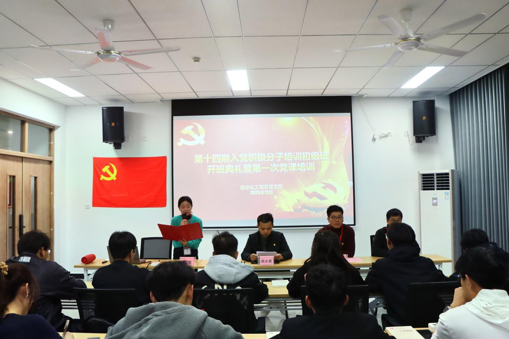 为全面贯彻党的二十大精神,教育引导入党积极分子端正入党动机,11月14日晚,自动化工程系第十四期党校初级班开班典礼暨第一次党课培训于敏行楼401准时举行。此次开班典礼由我系党支部组织委员俞青主持,党支部副书记高水冕参加本次典礼,并作为第一课主讲人。参加本次典礼的还有党支部宣传委员潘久伟、党支部青年委员唐建伟。