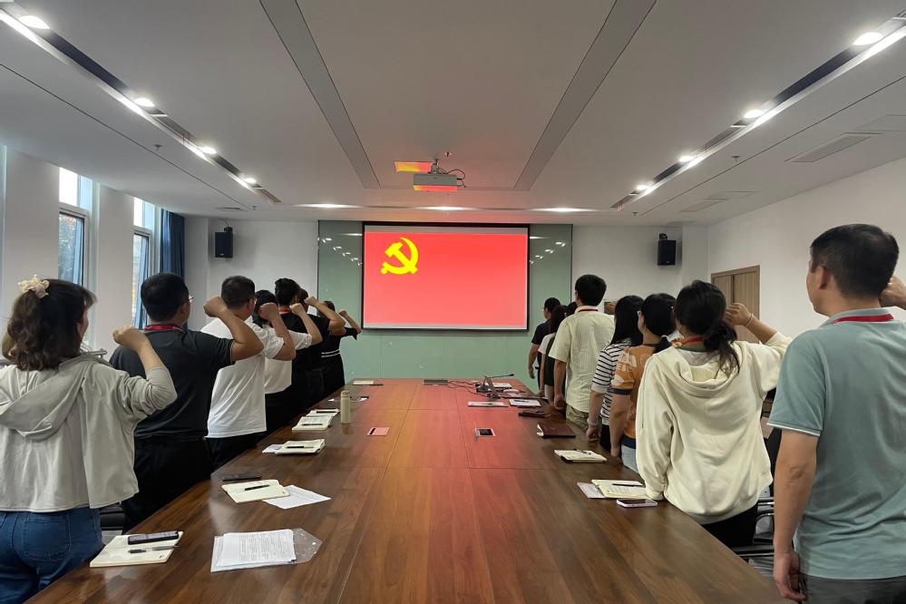 最后,与会全体党员紧握右拳,面向党旗庄严宣誓,一同重温入党誓词。在铿锵有力的宣誓声中,新老党员共同接受了一次深刻的精神洗礼,将主题党日活动推向高潮。75年栉风沐雨、砥砺前行,75年波澜壮阔、辉煌壮丽,中华民族奋斗史便是一部发扬传统、爱国奋进的历史。我们定当不忘初心、牢记使命,锐意进取、团结奋斗,为中华民族伟大复兴贡献力量。