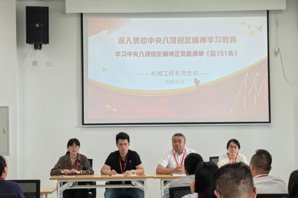 为深入贯彻落实中央八项规定精神,加强党风廉政建设,6月12日,机械工程系党支部在401会议室组织开展了中央八项规定精神正负面清单专题学习活动。此次活动旨在通过系统学习,进一步强化党员的纪律意识和规矩意识,营造风清气正的政治生态。校党委委员、副校长刁爱军列席了本次学习活动。