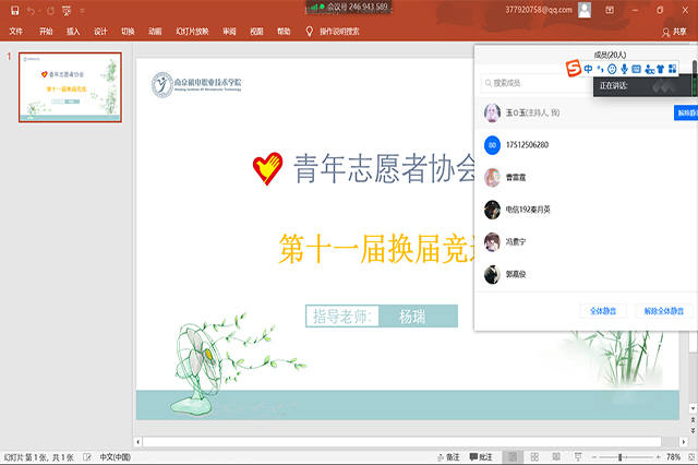 为给南机电青协选取下一届的新生力量,2020年7月1日青年志愿者协会举行了优秀志愿者表彰暨换届选举。由于疫情原因,大一的志愿者们无法返校,所以此次的选举采用线上腾讯会议的形式,青协指导老师、会长、副会长以及各个部门部长、副部长齐聚知行楼211,开展此次会议。