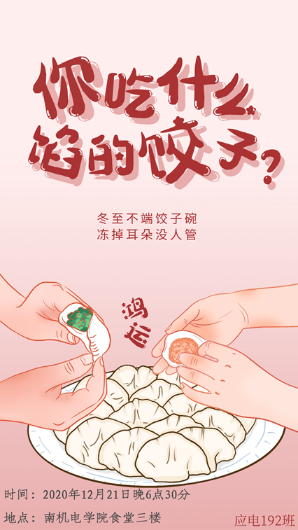 12月21日,电子工程系应电192班全体班委齐聚电子工程系办公楼,为系部老师送上冬至饺子,与老师们共享传统节日的暖心。当天傍晚,19应电2班全体同学迎冬至的活动在食堂三楼进行的如火如荼。本次活动由班长陈柏友全权策划。