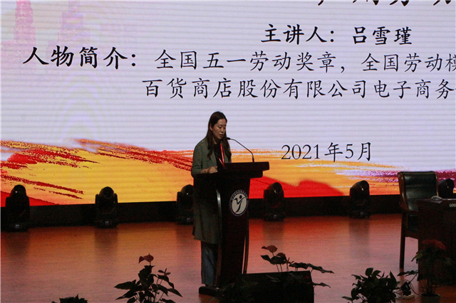 报告会上,吕雪瑾总监分享了习近平总书记在全国劳动模范和先进工作者表彰大会上的讲话精神,并通过“苦练内功,做追求极致服务的专家型销售状元”、“精准发力,做聚合正能凝聚人心的党支部书记”、“承启未来,做实体商业网络服务的弄潮儿”、“大爱无疆,做弘扬新时代主旋律的带头人”四个方面讲述了她在个人职业道路上的匠心服务与劳模心得。她提到:每个人都可以在平凡的岗位上做不平凡的事,而劳模更需要践行新时代无私奉献的精神,发挥引领辐射作用,希望同学们只争朝夕,成为“以劳动托起中国梦”的社会主义建设者和接班人,弹奏和谐共享的时代最强音!