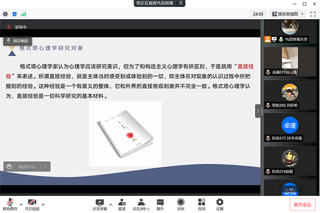 培训伊始,电子工程系刘依林老师向同学们介绍了“格式塔”名字的产生由来,随后分别深刻讲解了“格式塔心理学”的两个研究对象——“直接经验”和“行为”,通过两幅图片给予参加培训的同学们辩证的思考“你看到了什么?”加深同学们对于“格式塔心理学”研究对象的了解。接着依据社会、哲学、科学以及心理学四大背景展示了“格式塔心理学”的产生过程和变革。然后将“格式塔疗法”和“生物反馈疗法”进行对比,让同学们了解了“格式塔疗法”的九大原则。
