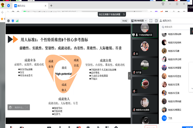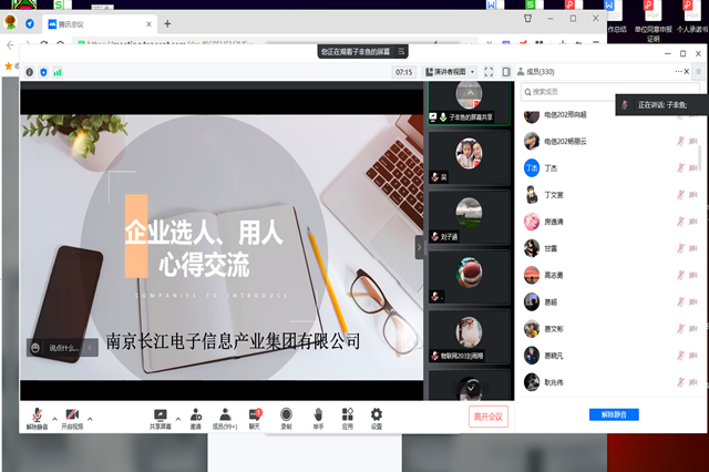 为了帮助同学们在步入职场后能够很好的做好自我发展规划、明确目标,为即将开始的职业生涯做好准备。5月18日晚上7点,我系通过腾讯会议开展了《企业选人用人》线上就业指导讲座,本次讲座邀请了南京长江电子信息产业集团有限公司人力资源部沈莉萍部长主讲。