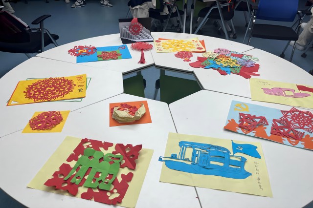 在活动过程中,同学们结合党史学习教育,用网络方式习得泥塑制作的步骤和需要用到的技法、选色等知识,用泥塑重温红色经典,传承红色记忆,创作了十余组主题泥塑,塑造出诸多革命人物形象。同学们还用一幅幅红色主题剪纸作品致敬党的光辉历史传承红色文化,小小的剪纸不仅是民间传统艺术的代表,更是党建思想红色文化的寄寓。