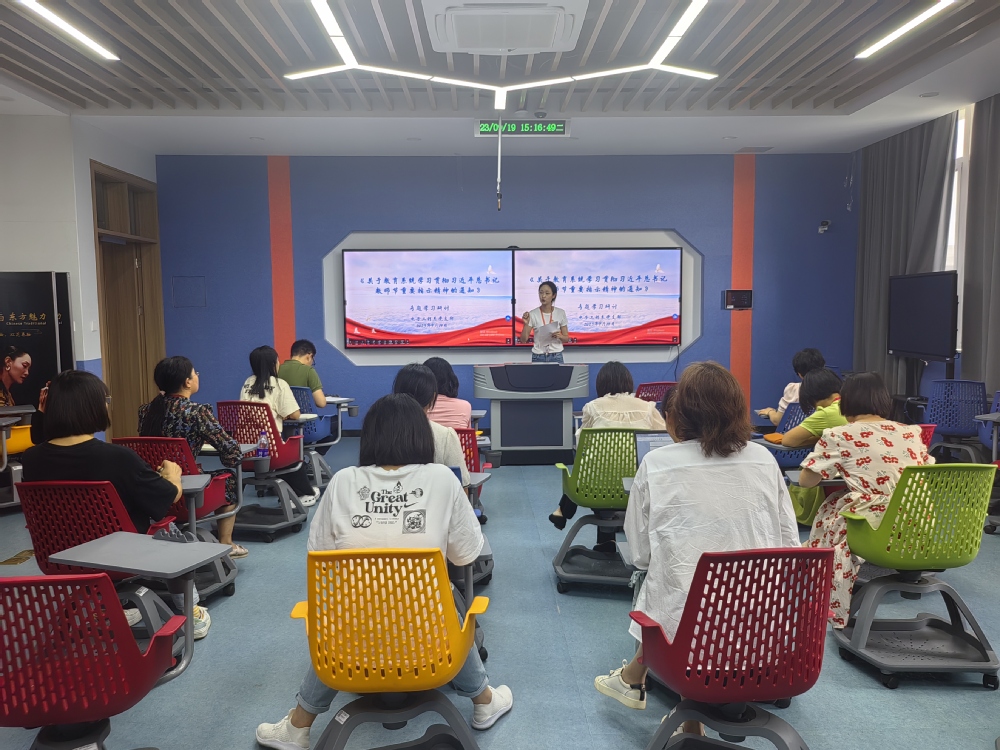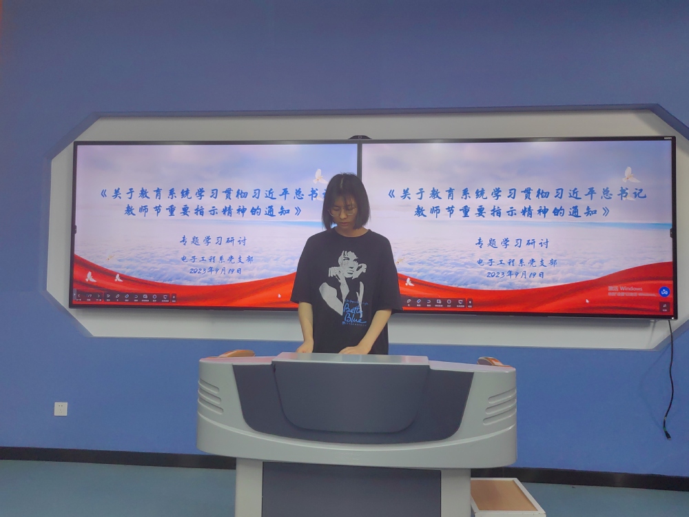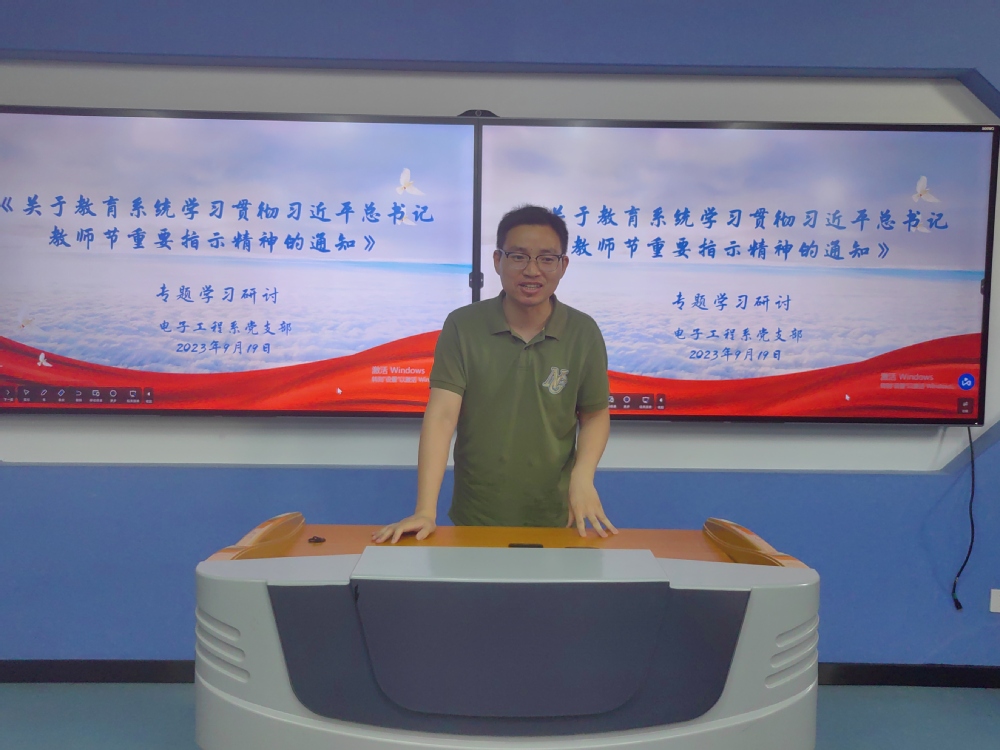 2023年9月19日,电子工程系党支部在思学楼411开展关于学习贯彻习近平总书记教师节重要指示精神专题研讨会,本次会议由党支部副书记唐钰峤主持,所有系部党员参加学习。