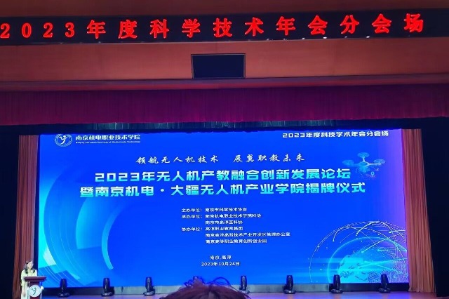 2023年10月24日下午,2023年度科技学术年会分会场——无人机产教融合创新发展论坛暨南京机电•大疆无人机产业学院揭牌仪式在学校青春剧场顺利举行。本次活动由南京市科学技术协会主办,由开云手机官方版页面登录入口科协、南京市高淳区科协承办,由高淳职业教育集团、南京高等职业教育创新创业园等共同协办。南京航空航天大学研究生院副院长郑祥明,南京航空航天大学飞行器设计专业工学博士、教授唐正飞,高淳区科学技术协会副主席杨腊斌,南京高等职业教育创新创业园党工委委员、副主任孙爱国,深圳市大疆创新科技有限公司华东区代表滕菲,南京弘谷信息科技有限公司总经理赵华君,南京弘谷信息科技有限公司副总经理顾启凌,学校党委委员、副校长刁爱军,党委委员、纪委书记、工会主席姜振宇等领导出席本次活动。本次活动由学校科研及校企合作处处长李木香主持,电子工程系全体教师及学生代表,高淳职业教育集团理事单位江苏省高淳中等专业学校和高淳第一中学的师生代表参加了本次活动。