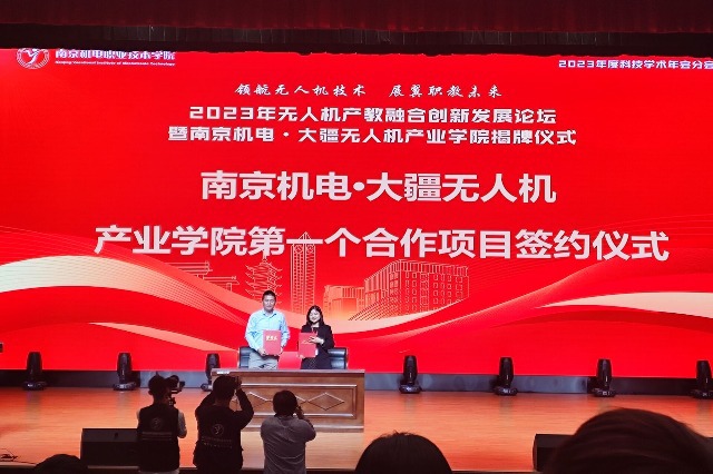 2021年,学校与深圳市大疆创新科技有限公司签订共建“南京机电-大疆无人机产业学院”校企合作框架协议,构建“产、学、研、创、用”于一体,互补、互利、互动、多赢的行、校、企协同育人平台。刁爱军表示,未来学校与深圳大疆创新科技有限公司将共同探索示范性全路径培养模式,打造以人才培养、技能竞赛、教师实践、技术培训、社会服务功能于一体的产学研创”现代服务产业学院。揭牌及签约仪式上,学校党委委员、副校长刁爱军与深圳市大疆创新科技有限公司华东区代表滕菲共同为“南京机电•大疆无人机产业学院”揭牌。学校电子工程系主任姚小冬与滕菲为“南京机电•大疆无人机实训基地”揭牌。学校党委委员、纪委书记、工会主席姜振宇与南京弘谷信息科技有限公司总经理赵华君共同签订“南京机电•大疆无人机实训基地设备捐赠协议”。电子工程系副主任丁向琴与南京弘谷信息科技有限公司副总经理顾启凌共同签订“南京机电•大疆无人机产业学院第一个合作项目协议”。学校与深圳市大疆创新科技有限公司将本着优势互补、共同发展的宗旨,坚持“育人为本、产业为要、产教融合、创新发展”的建设原则,以区域无人机产业行业发展急需为牵引,立足机电学院办学定位和发展思路,建立长期、紧密的合作关系,打造融专业人才培养、关键核心技术研究、前沿技术创新应用推广、专业师资赋能、辐射地方产业、企业孵化服务、学生创业辅导等功能于一体的无人机领域示范性人才培养实体。