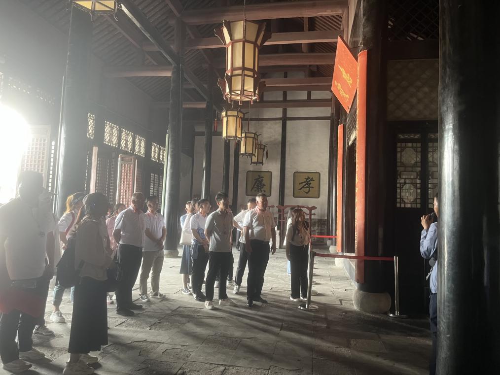 同志们心怀敬畏走进淮安府署,深入了解淮安府署的历史文化,感受历史的厚重与力量,从而进一步增强党员教师的历史责任感和使命感。淮安府署作为古代封建朝廷在惩治腐败、倡导廉政方面的文化遗存,拥有丰富的廉政文化资源。大家在讲解员的带领下,参观了府署的六部、正堂和军捕厅等地,仔细观看了廉政方面的照壁、仪门、戒石坊、对联、刑具等文化遗存。这些文化遗存不仅展现了历代朝廷在廉政建设方面的举措和经验,更体现了对为官者廉洁自律、勤政为民的严格要求。