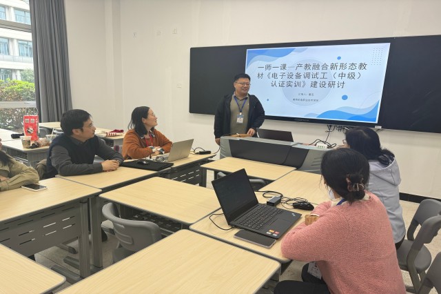 本次教研活动由系专业教师雷迅主持,他首先介绍了《电子设备调试工(中级)认证实训》教材的编写思路与特色。该教材以“项目导向、任务驱动”为编写理念,紧密结合电子设备调试工的职业标准和工作实际,采用模块化设计,内容涵盖了电子设备调试的基础知识、核心技能和行业应用。他还分享了教材编写过程中的一些创新做法,如引入案例、增加实训项目等,以期提升学生的学习兴趣和实践能力。在研讨环节,与会教师们围绕教材内容的实用性、教学方法的创新性、教学资源的丰富性等议题展开了热烈讨论。张志鹏强调了产教融合在培养学生实践能力中的重要性,并建议教材中应增加更多与企业实际工作流程相符合的教学案例。