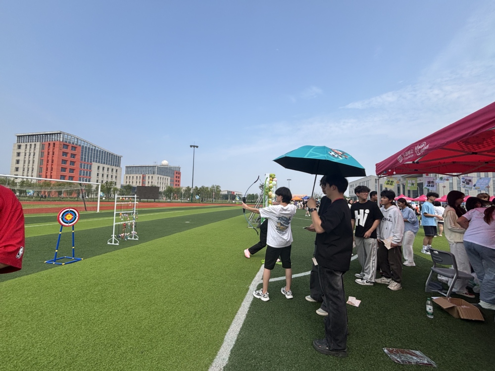 射靶环节成为活力与勇气的象征。靶场上,同学们屏气凝神,拉弓的手臂微微颤抖,却充满挑战自我的坚定。电信242班王远浩同学一箭十环入靶,引得现场欢呼,他毫无保留地向同伴分享技巧,手把手调整同学们的拉弓姿势,鼓励大家“别怕失败,大胆尝试”,让原本紧张的同学射中靶心,兴奋的欢呼声回荡在操场。成功的喜悦中,射靶不仅是场游戏,更让学子们在挑战与互助中,收获直面内心的力量。